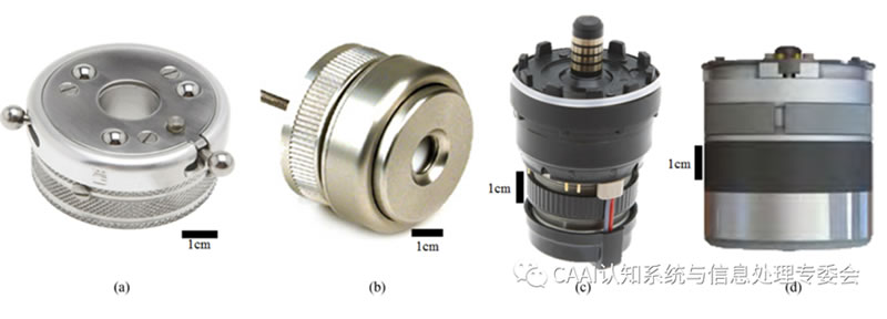 主動單自由度腕部通常在假肢和機(jī)器人應(yīng)用中都能找到。在假肢L域,這些系統(tǒng)通常與EMG系統(tǒng)一起使用,使用戶能夠通過肌肉信號控制旋轉(zhuǎn);顒邮滞罂梢允仟(dú)立的單元集成到假手中,或者集成到較大假手中的前臂中。與被動手腕類似,主動單自由度裝置也可分為旋轉(zhuǎn)器和屈肌。主動旋轉(zhuǎn)器是腕部假體中常見的動力裝置。獨(dú)立設(shè)備包括運(yùn)動控制電動旋轉(zhuǎn)器和OB腕部旋轉(zhuǎn)器,如圖(c)所示,這兩種設(shè)備都是為與許多終端設(shè)備兼容而設(shè)計的,因而得到了相對廣泛的應(yīng)用。OB-Michelangelo手和TBi-Limb Quantum都使用緊湊的旋轉(zhuǎn)器,即軸旋轉(zhuǎn)和俯臥旋轉(zhuǎn)[圖(d)],它們分別安裝在各自手的假體窩和下手掌中,主動屈肌也往往納入現(xiàn)有的機(jī)器人手或終端設(shè)備系統(tǒng)。